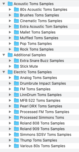 The classic electronic toms were recorded from a variety of classic drum machines. (LinnDrum LM1 and LM2, Roland TR808, TR505, and TR909, Alesis SR18, Simmons SDS 800 and SDS3, Pearl DRX, MFB 522, …)